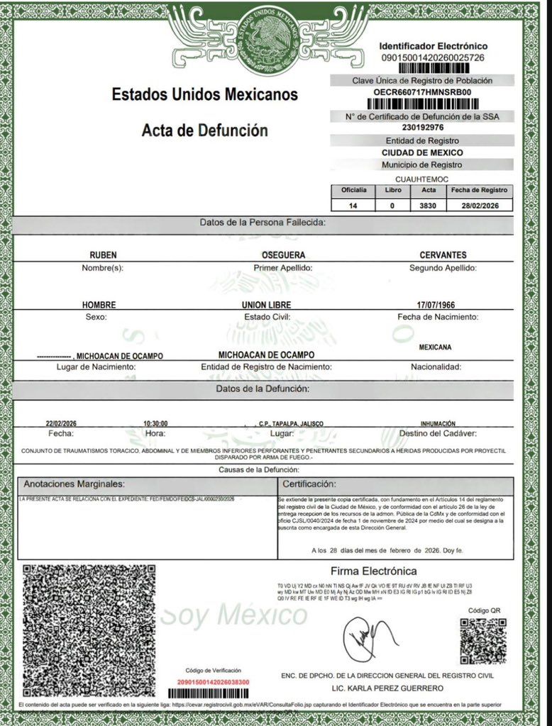 El misterio que rodeaba el paradero del líder criminal más buscado de México ha quedado zanjado sobre el papel. El acta de defunción número 3830, expedida por el Registro Civil de la Ciudad de México, confirma que Rubén Oseguera Cervantes, alias “El Mencho”, falleció el pasado 22 de febrero de 2026 a las 10:30 horas. El líder del Cártel Jalisco Nueva Generación (CJNG) sucumbió ante un conjunto de traumatismos provocados por proyectiles de arma de fuego durante un enfrentamiento con fuerzas federales.